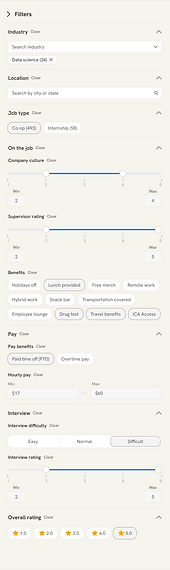 Navigation is now intuitive and efficient. Key filters sit at the top, while a clear toggle lets users view jobs, companies, or both. With an organized side panel, users can manage and filter through detailed criteria to find the exact co-ops they’re looking for.