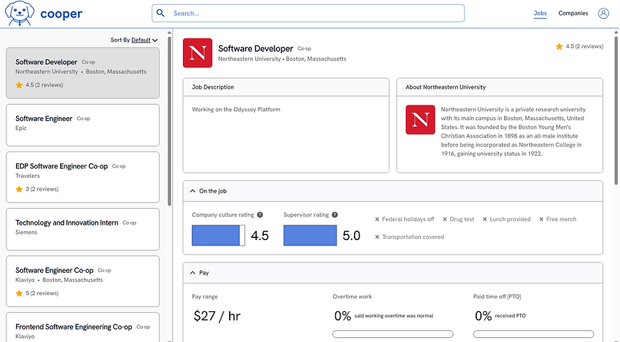 Part of a team of 3 designers, 4 developers, and 1 project lead at Sandbox tasked with building Cooper, a student-driven co-op review platform where users can explore co-op reviews from past employed students to make informed job decisions.