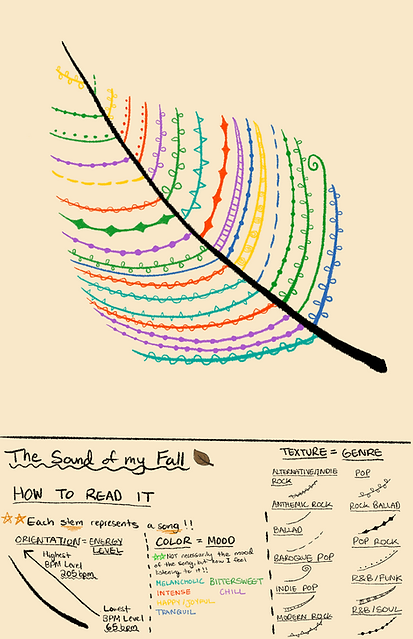 Inspired by Dear Data by Giorgia Lupi, U created a personal infographic of my fall playlist as an abstract artwork. Rather than striving for simplicity or immediate legibility, I wanted to challenge conventional expectations of infographics. I believe data visualization can also be poetic and something that invites curiosity and interpretation. Each color, pattern, and mark represents a different aspect of my listening experience, but their meanings are intentionally hidden without the key. This encourages viewers to slow down and explore the logic behind the design.