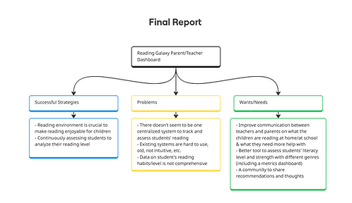 Our team conducted three user interviews: two with parents and one with a teacher. Using our interview notes, we organized insights into three categories: successful existing strategies, problems, and wants/needs.
