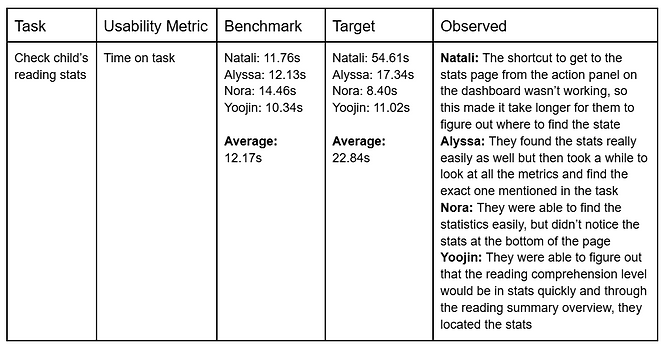 My team and I conducted a usability metric to evaluate how easily users could interact with the platform and identify areas for improvement. This was the usability metric for the task of "checking the child's reading stats."